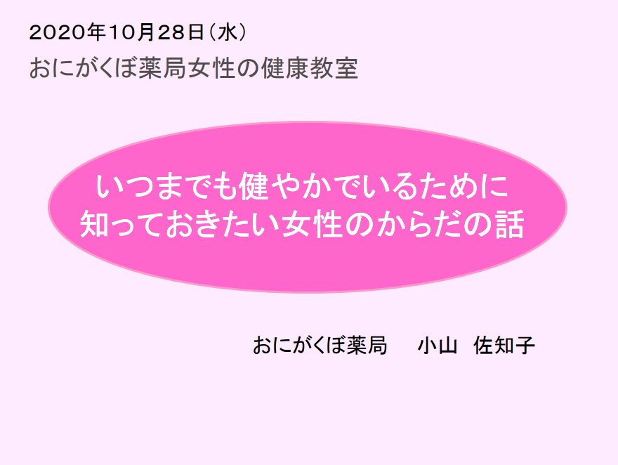 「女性ホルモンと女性の健康」についての健康セミナー実施のお知らせ 2021年8月3日 お知らせ おにがくぼ薬局 昨年10月28日、女性が健やかで生き生きと生きて行くための「女性ホルモンと女性の健康」について健康セミナーを実施しました。当日は、感染対策を十分に考慮し少人数の参加者に加えオンラインでも多数ご参加いただきました。 いつまでも健やかでいるために知っておきたい女性のからだの話(PDF)
